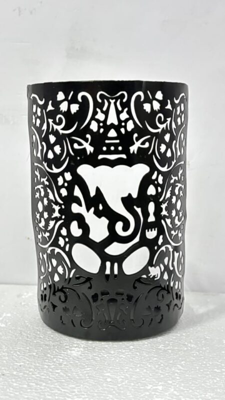 a black cylindrical candle holder with a detailed, cut-out design by 2crafts