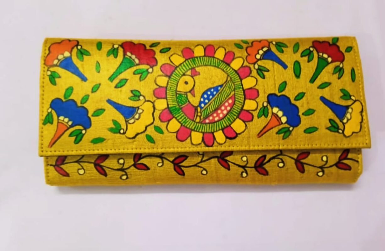 a hand-painted clutch bag featuring traditional Madhubani art by antara verma