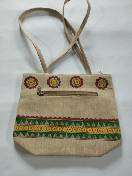 a vibrant yellow sling bag featuring intricate, hand-painted artwork in the traditional Madhubani or Mithila style. Material and Color: The bag appears