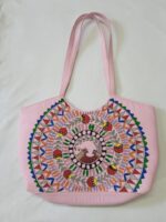 a pink tote bag adorned with a vibrant, hand-painted design in the traditional Indian Madhubani art style.