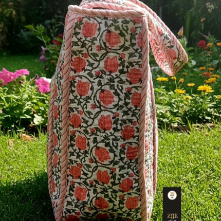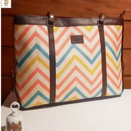 The bag features a striking, repeating geometric pattern in shades of deep red, blue, and gold/yellow, composed of circles within squares. It has dark brown leather (or leather-look) handles and trim. The background is a wall made of horizontal wooden planks. To the right of the bag, a small white object, possibly a teapot or decorative item, is partially visible.