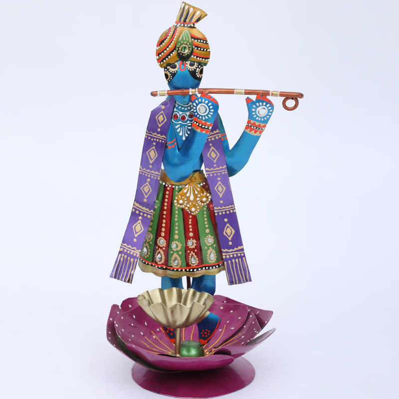 Decorative Krishna Multicolour Metal Table Tea Light Holder Colorful Indian Musician Sculpture by decorum