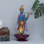 Illuminate your space with this stunning decorative Krishna multicolour metal table tea light holder. Crafted with intricate detailing, this piece showcases the beautiful form of Lord Krishna, enveloped in vibrant hues that add a touch of spirituality and warmth to any setting. Whether you place it on a dining table, a mantelpiece, or a cozy corner, this tea light holder creates a serene ambiance as the soft glow of tea lights dances through the ornate cutouts.