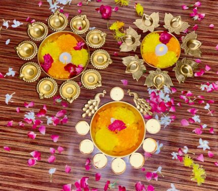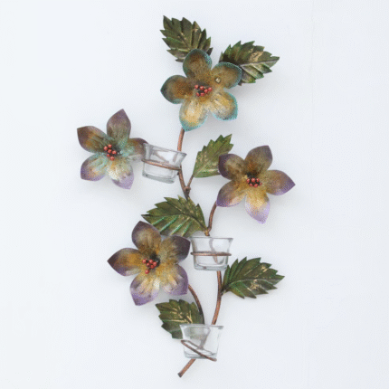 a round, flat, wooden tealight candle holder with a colorful, hand-painted design. The holder has a central metal cup containing a white, unlit tealight candle.Â