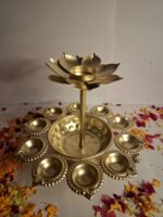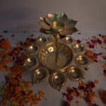 a collection of traditional Indian oil lamps, known as diyas, crafted from brass or a similar golden-hued metal, arranged on a surface adorned with scattered flower petals in shades of orange and red/pink. The diyas are typically used for religious rituals and festivals, such as Diwali, and can also serve as decorative items for floating flowers and tea light candles.Â