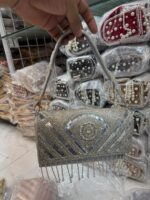 Partywear elegant handbag is designed with a beautifully embroidered handle adorned with dazzling diamond stones, offering both luxury and functionality. The sturdy handle provides a secure grip, allowing you to carry it effortlessly throughout the day and into the evening parties.