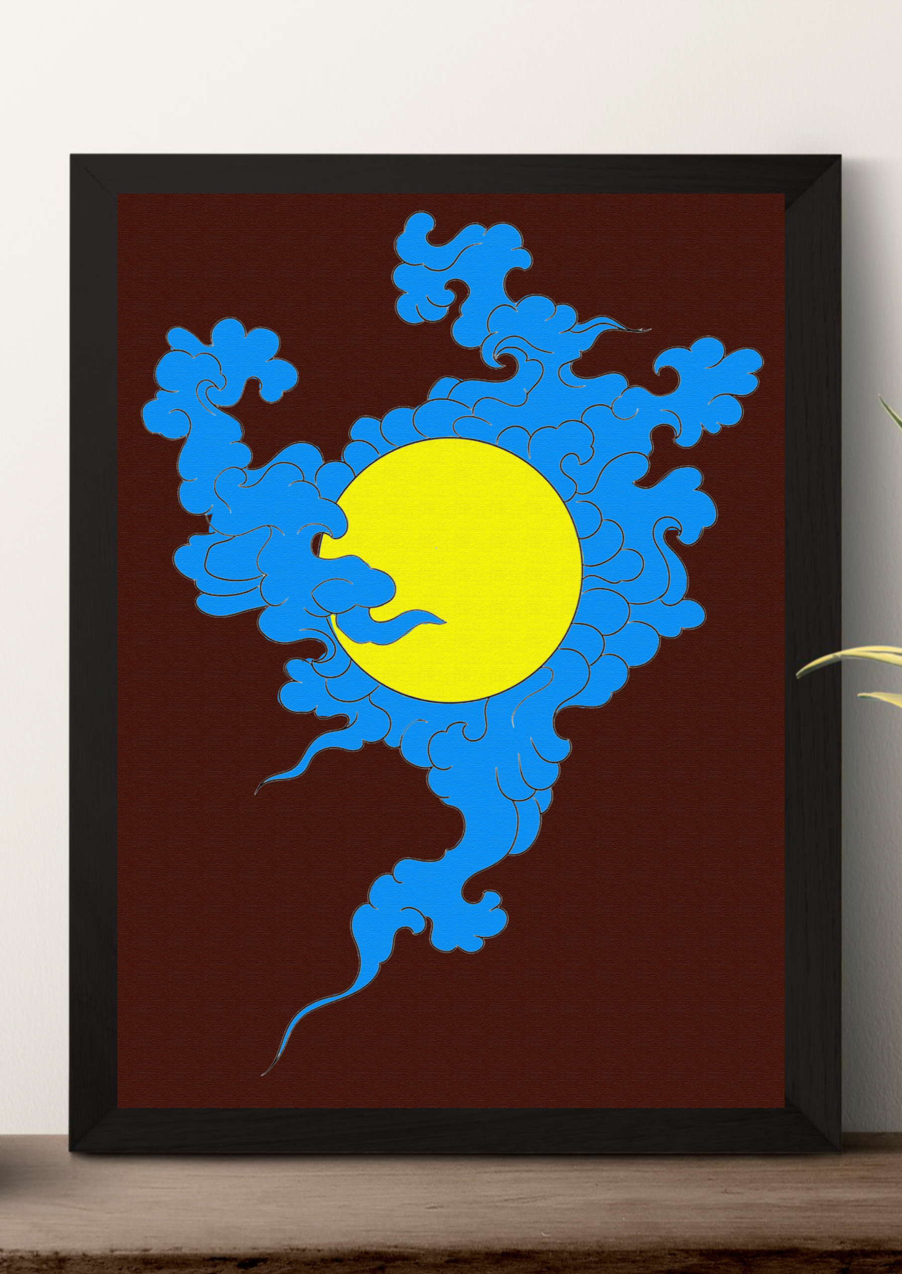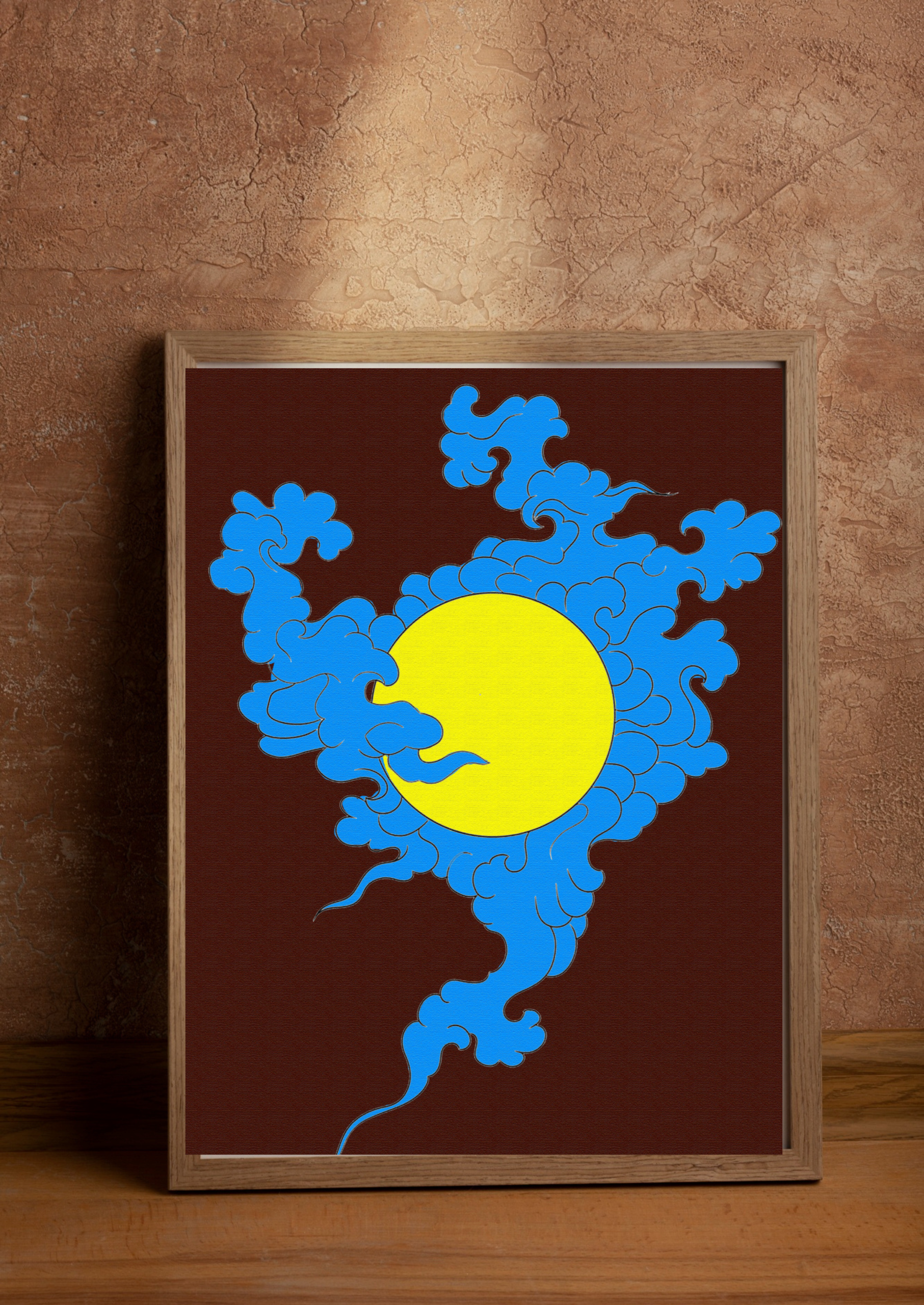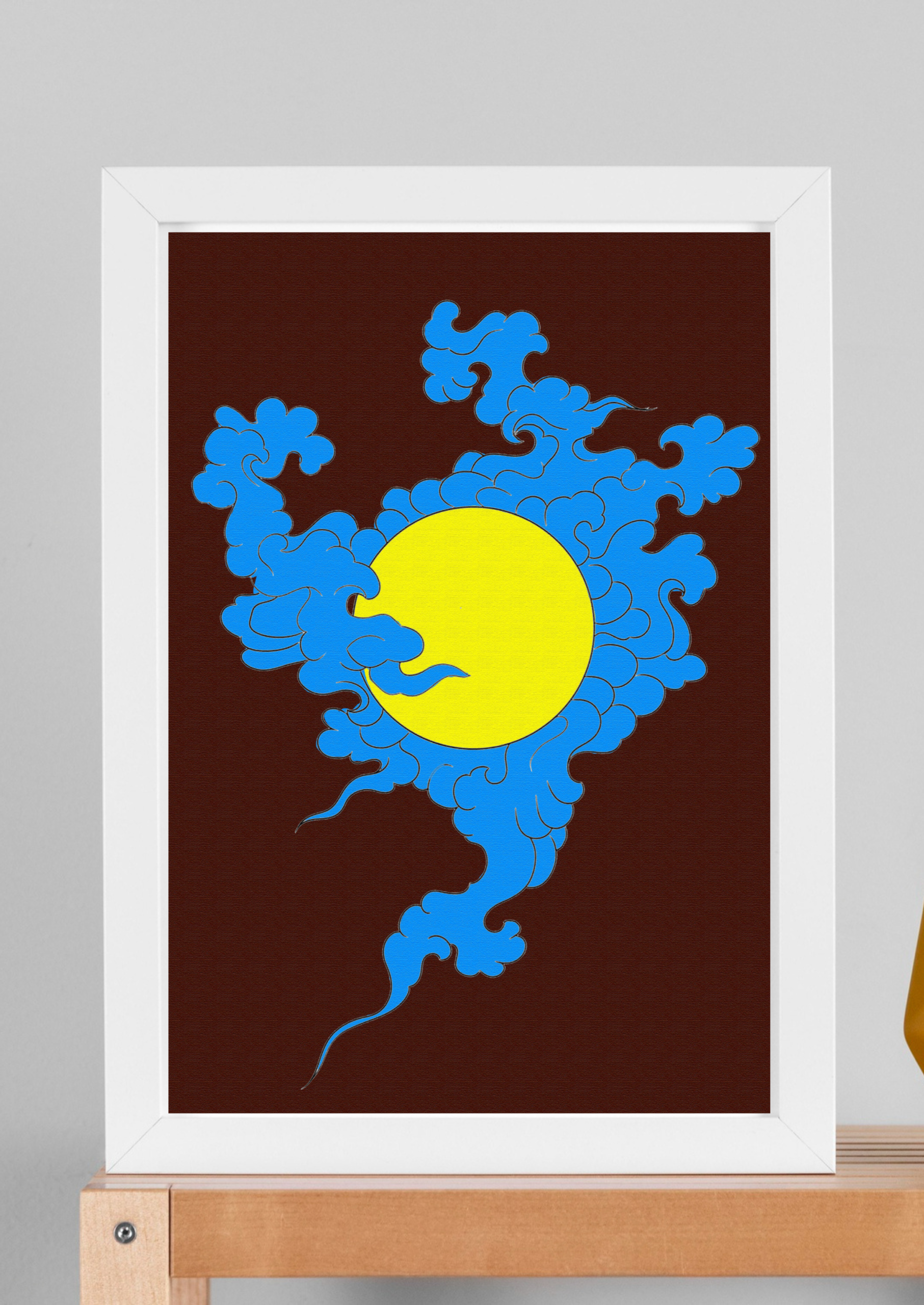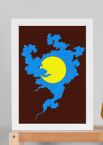 A stylized illustration featuring a large, solid yellow circle, which could represent the sun or moon, against a dark brown background. The circle is partially obscured and surrounded by intricate, swirling blue clouds with dark outlines. The clouds have a dynamic, flame-like or wave-like quality, with tendrils extending downward.