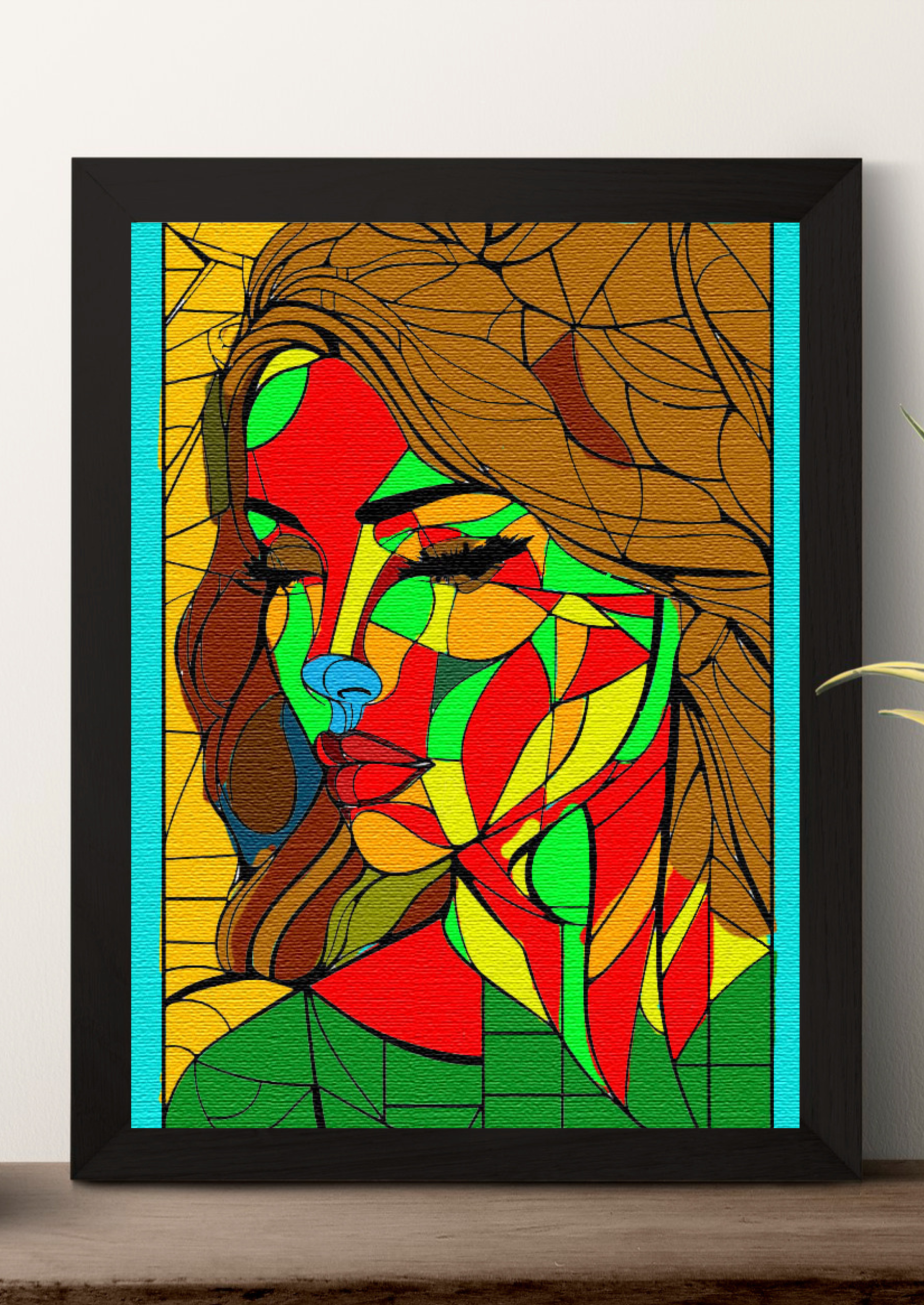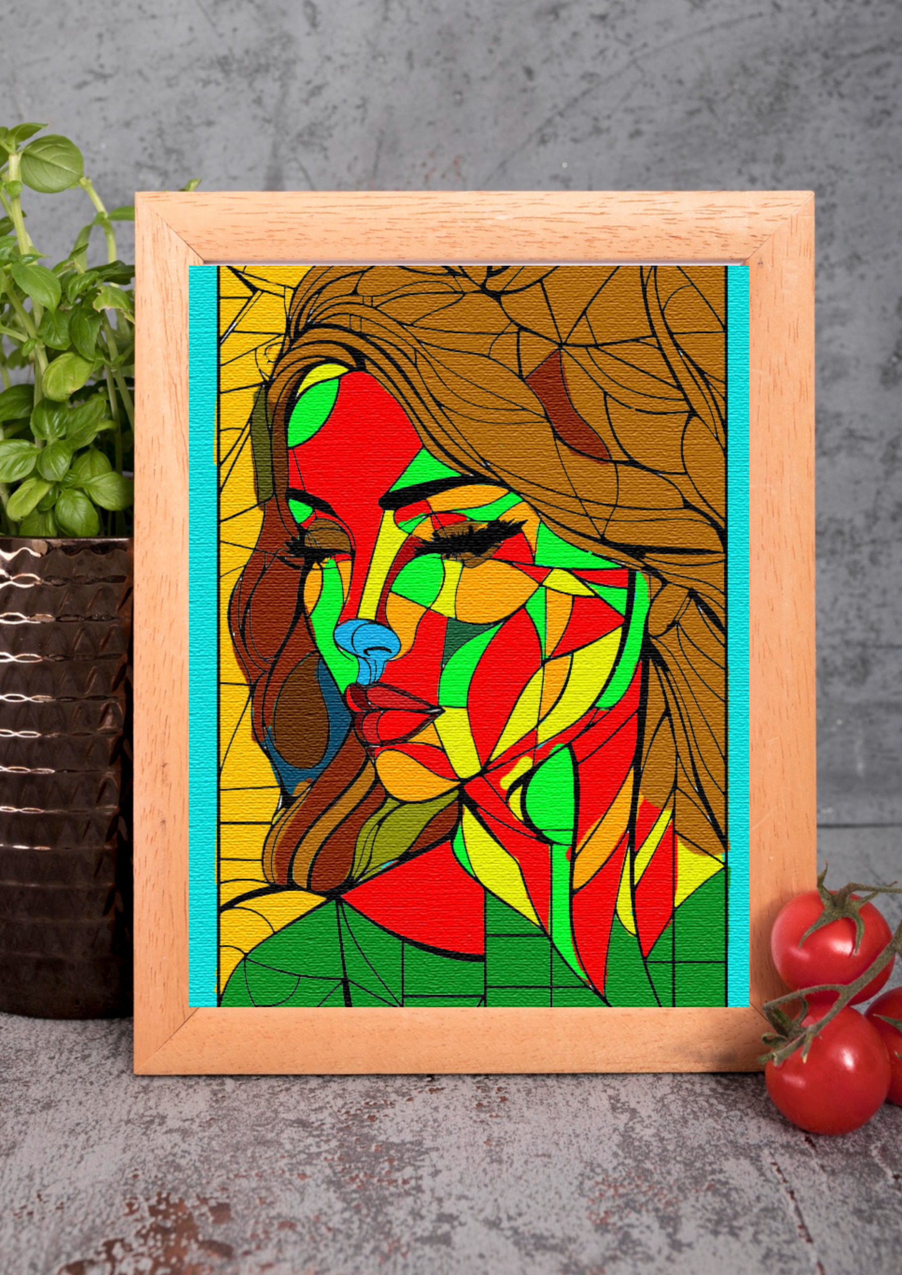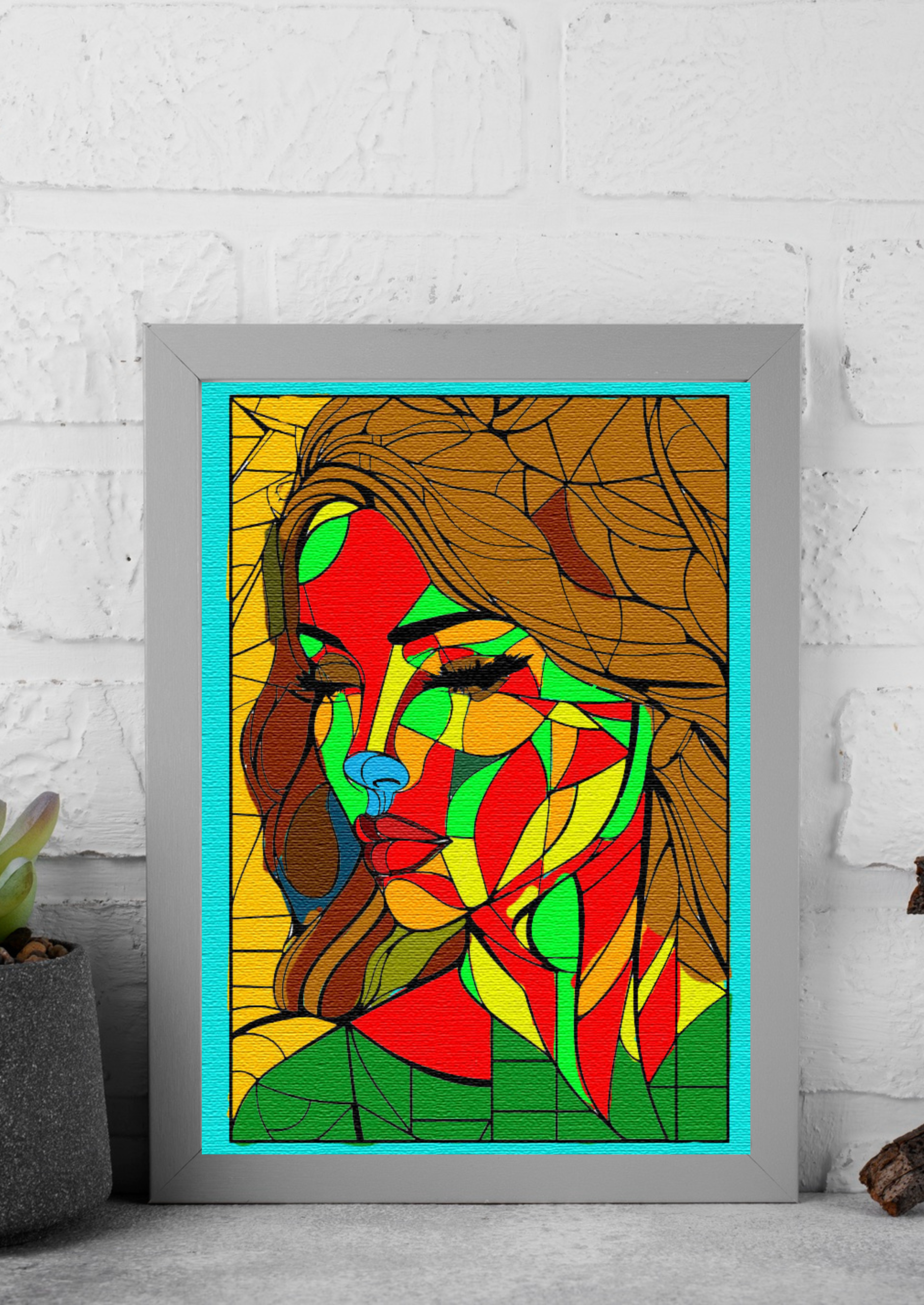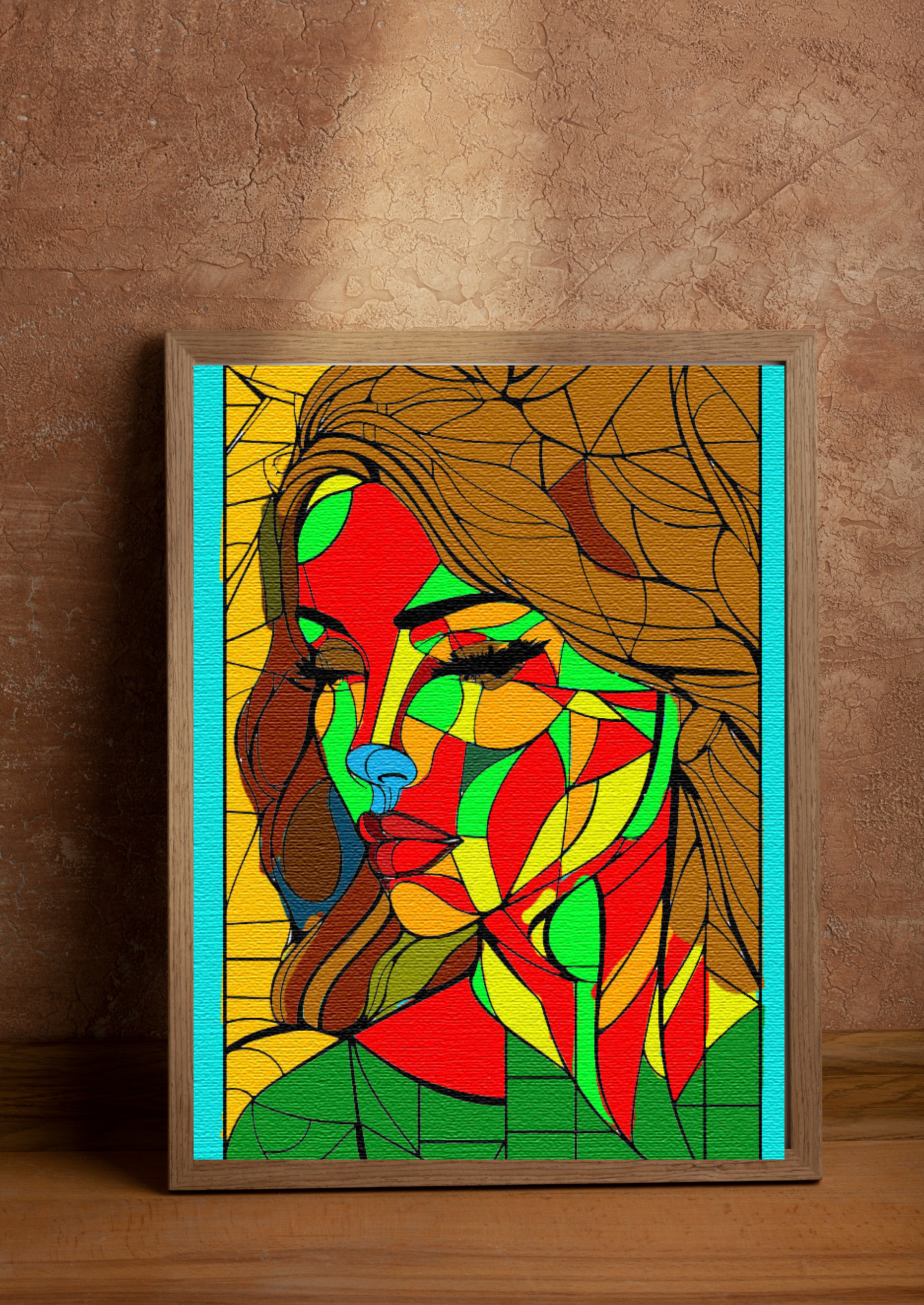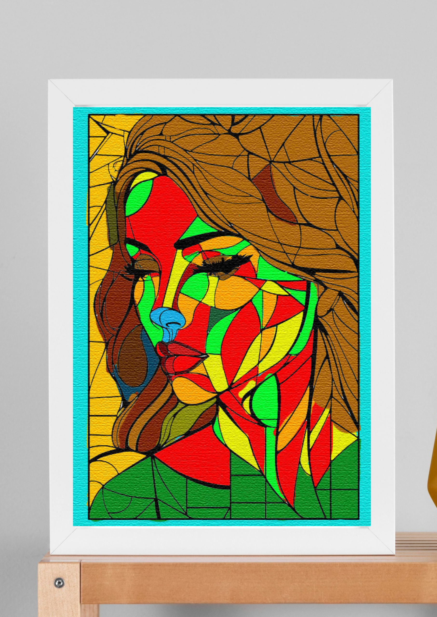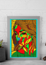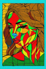 a stylized, colorful portrait of a woman’s face. The artwork has a fragmented, geometric style, similar to stained glass or cubism, with the face and hair broken into various shapes. The color palette is bold and non-realistic, featuring shades of red, green, yellow, and orange on the face, with the woman’s hair in brown tones. Her eyes are closed, and the background is a solid yellow.