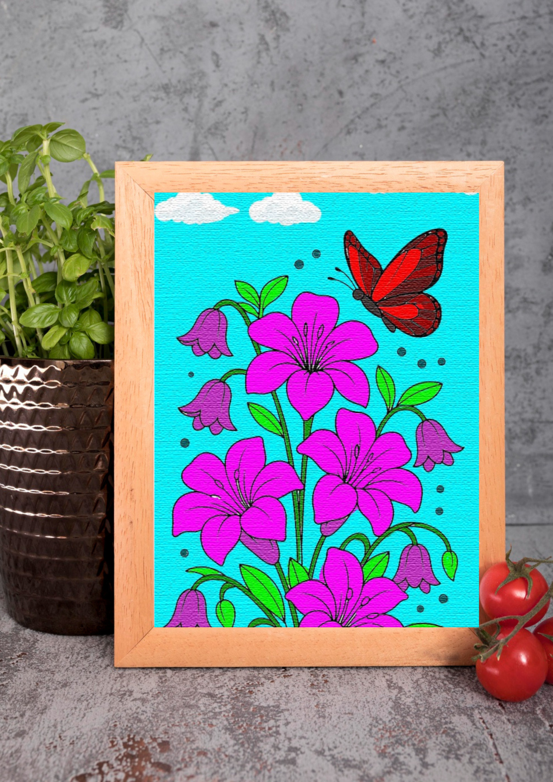 a colorful, stylized illustration of a red butterfly flying above a cluster of flowers. The flowers are primarily a vibrant magenta and purple, with bright green leaves and stems. The background is a solid turquoise color with several white, cartoon-style clouds floating in the sky. The entire image has a textured appearance, similar to a digital painting or a coloring page.