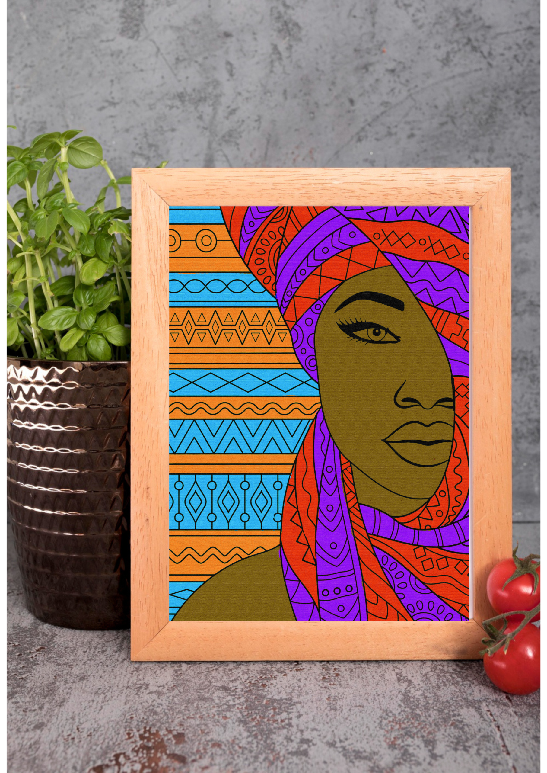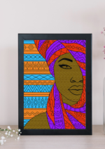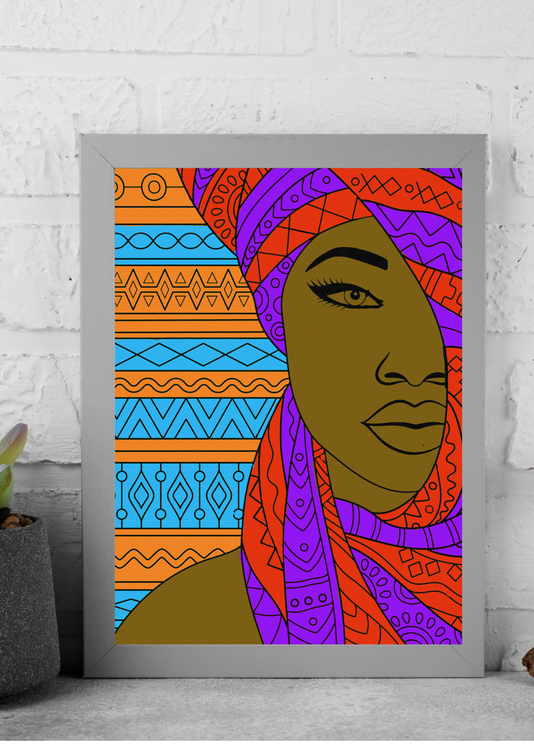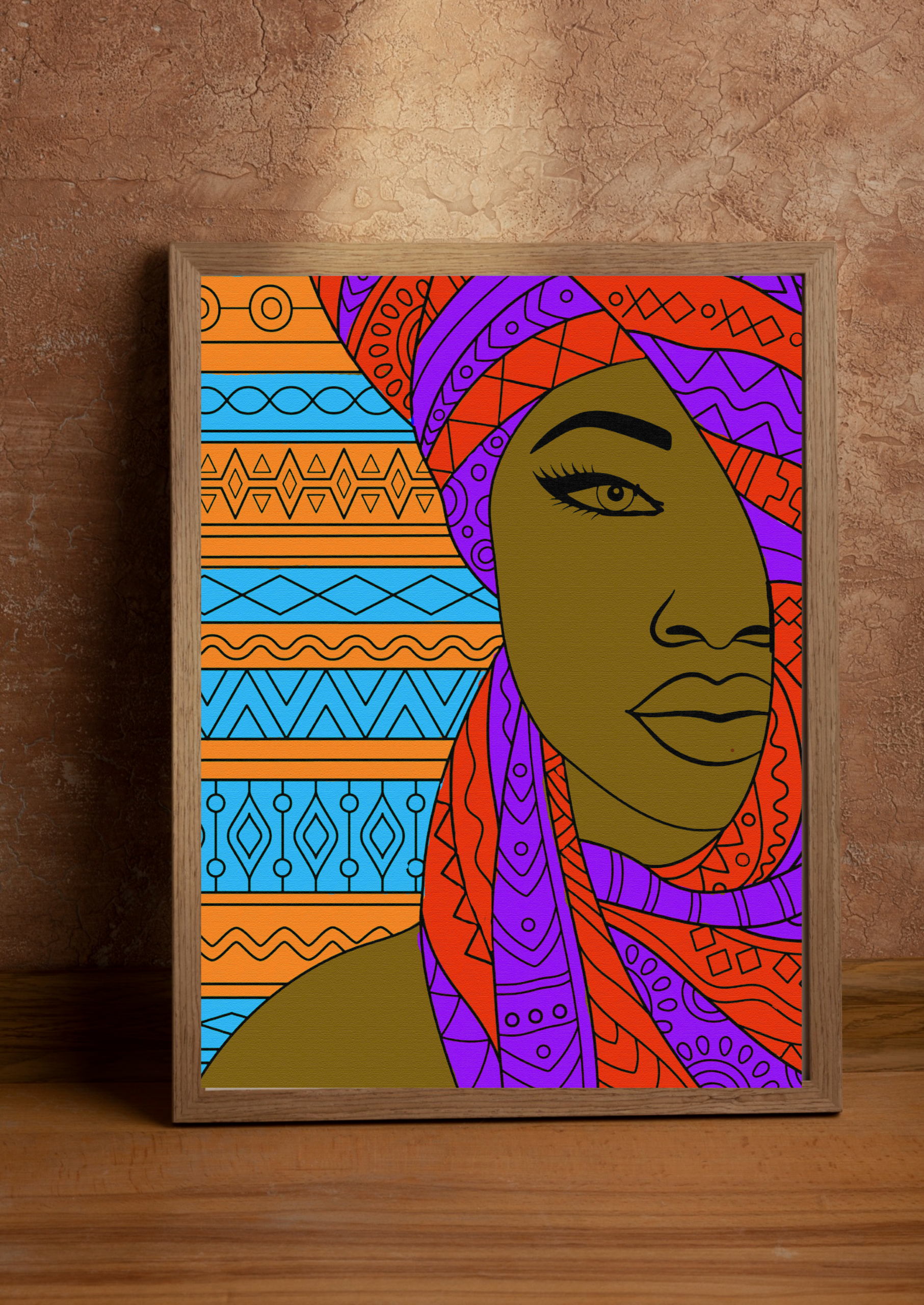 a stylized digital illustration of a Black woman wearing a vibrant, multi-colored headwrap and scarf. The woman’s face is depicted in profile, with a serene expression. The color palette is dominated by bold shades of purple, orange, and blue. The headwrap and background feature intricate geometric and tribal-inspired patterns, creating a visually striking composition.