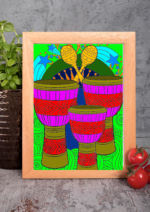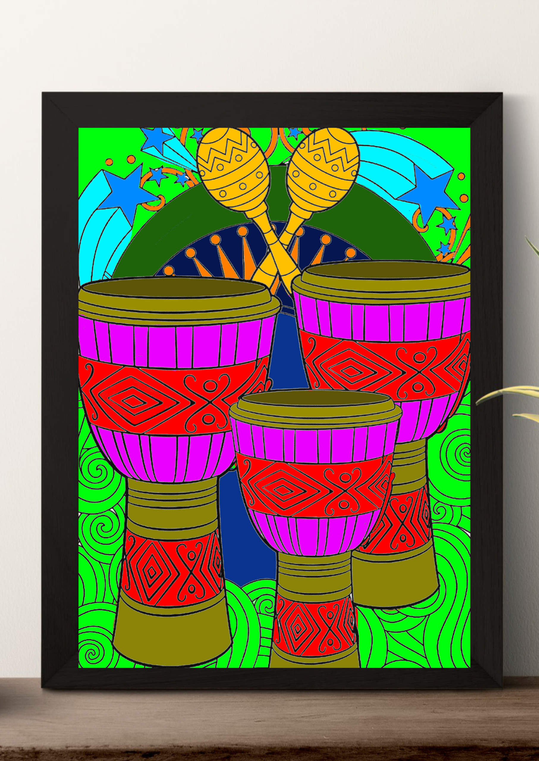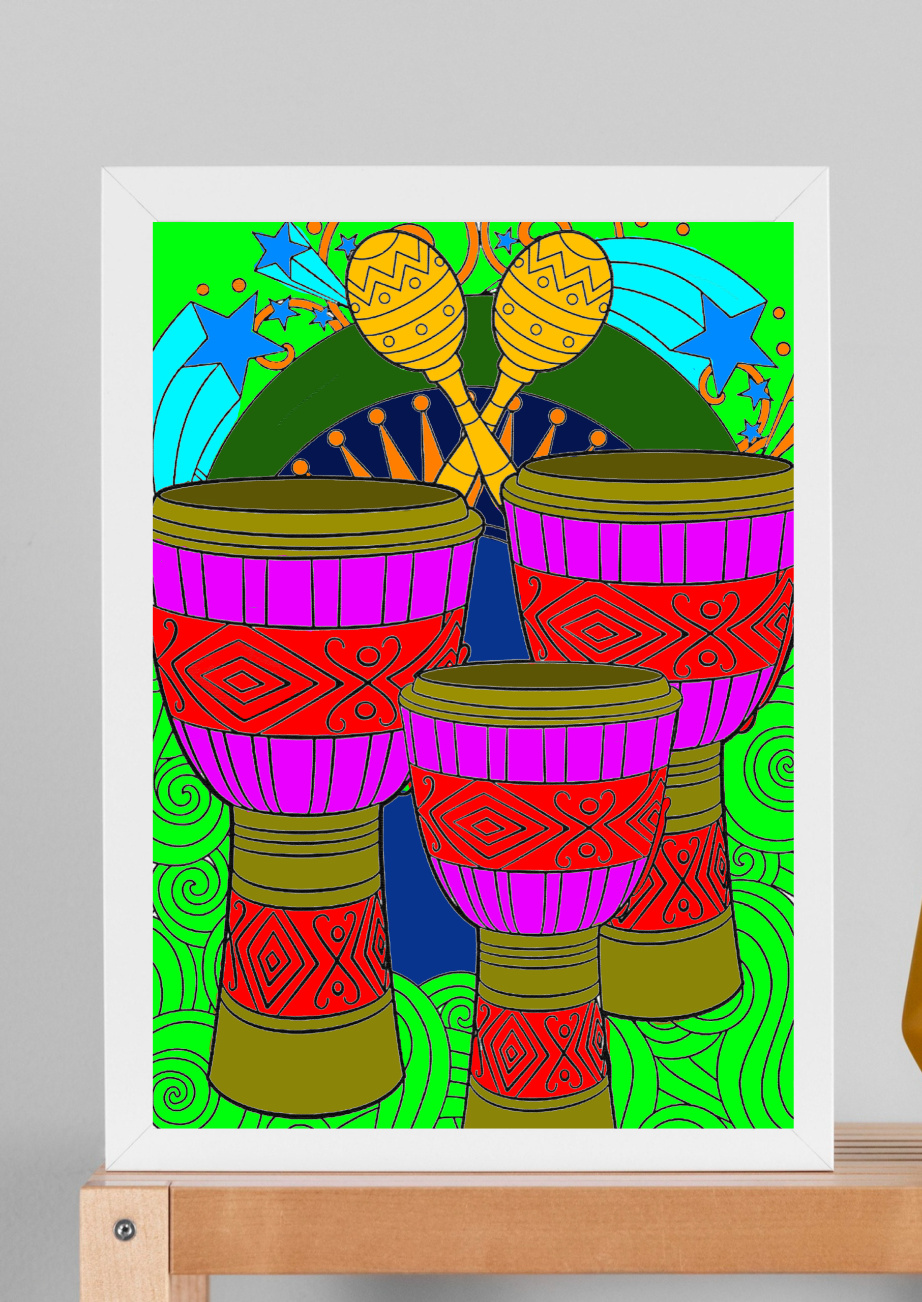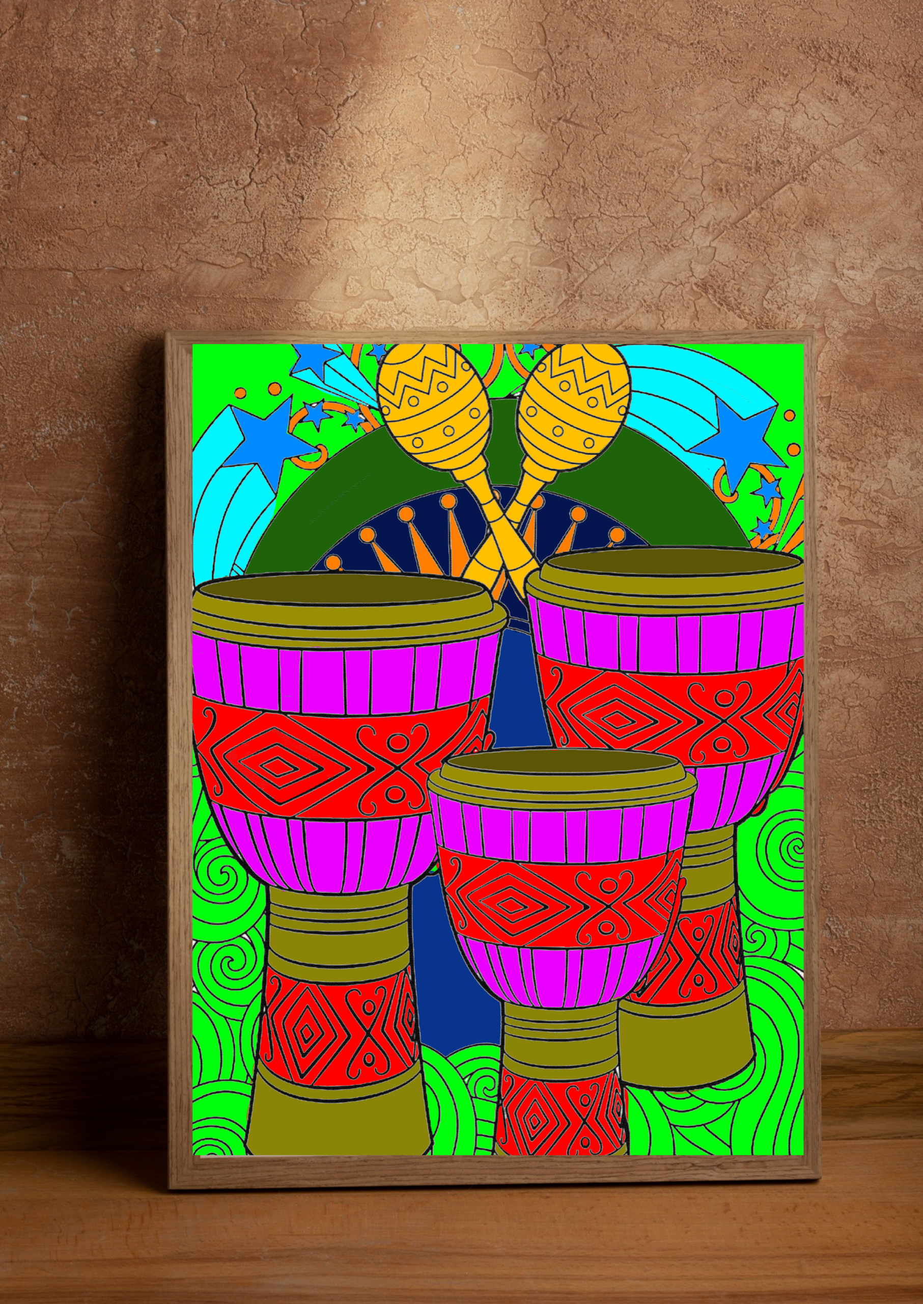 Patterns and Background: The drums are decorated with striking red geometric patterns against a magenta background. The overall background includes bright green swirls at the bottom and a dark blue section with yellow bursts and blue stars at the top, giving it an energetic and festive feel.
